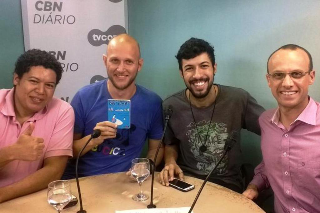 Os autores da coluna "Os Manés", publicada nos jornais da RBS, Rodrigo Stüpp e Jorge Jr, ontem na rádio CBN, falam da linguagem da ilha e exibem a primeira edição do "Dicionário da Ilha - Falar & Falares da Ilha de Santa Catarina", de Fernando Alexandre e Andrea Ramos, lançado há mais de 20 anos!